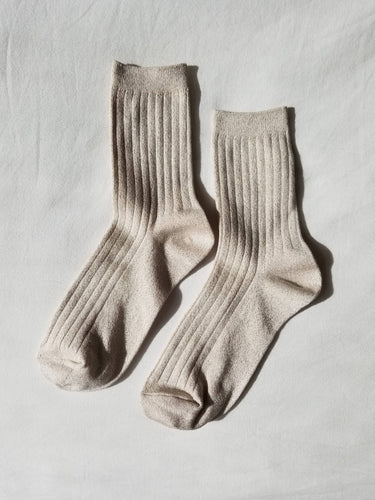 A little sparkle goes a long way. When we are feeling a little extra, this glittery version of our OG Her Socks is our go to gal. She adds a festive element to any outfit! Now in a super soft and supple modal blend yarn, these are the perfect height ribbed socks with just the right amount of sparkle. On those special occasions we love to dress her with a silky dress and strappy heels, or an elegant jumpsuit and pop color pump!