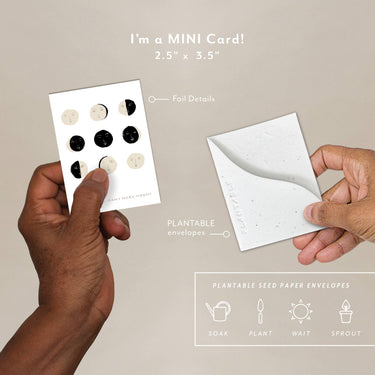 Meet the newest little SPROUT! Think all the goodness of our full size greeting card BUT at a petite "mini me" and super cute enclosure card size. All Seedlings sprouts have foil details and a PLANTABLE seed paper envelope which is embedded with wildflower seeds. This seed paper is made of a biodegradable eco-paper created with post-consumer materials - no trees harmed for this paper! When planted, our envelopes compost away leaving only flowers behind. Blank inside, our mini greeting cards are printed on premium paper and are all accented with foil details. Need a display? Order SPRDIS24 for a 24 pocket tabletop spinner. Card size: 2.5" x 3.5" All Seedlings cards are made in the U.S.A.
