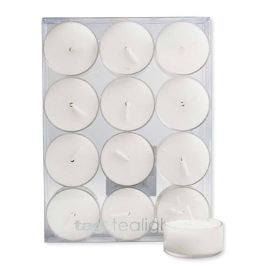 Classic tealight candles in aluminum cups. Perfect for restaurants & bars, celebrations, parties, weddings and other special events. Mix and match with a range of candle selections from tag. Set of 12. Wipe clean with soft cloth.