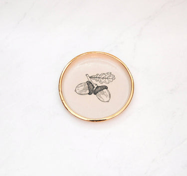 Crafted from screen-printed white stoneware and fired to cone 5, this piece features an elegant 22k gold rim.