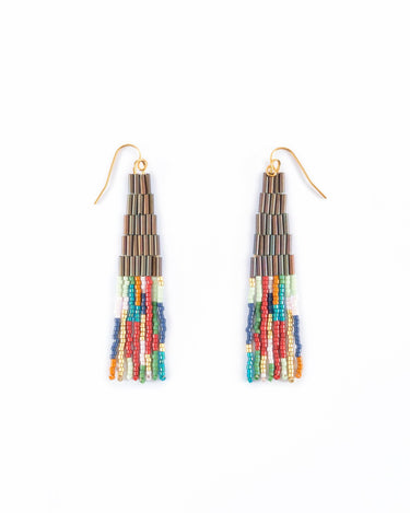 Lightweight, colorful, and unique, these handwoven Japanese Miyuki glass beaded earrings combine tubular beads with classic smaller beads for contrast. The hand strung fringe is made up of beautiful bead colors including gold for a touch of shimmer. This smaller earring size is perfect to use as an everyday accessory, while still making a statement with bold color combinations. These earrings are handmade by women artisans in Medellin, Colombia who receive fair working conditions and compensation for their skills. Materials: Miyuki Glass Beads Gold-Plated Stainless Steel Ear Wire Size: Length 3 Inches Width .5 Inch *This earring style is available in several color ways. **The last photos are included to show our earring cards and store merchandising.