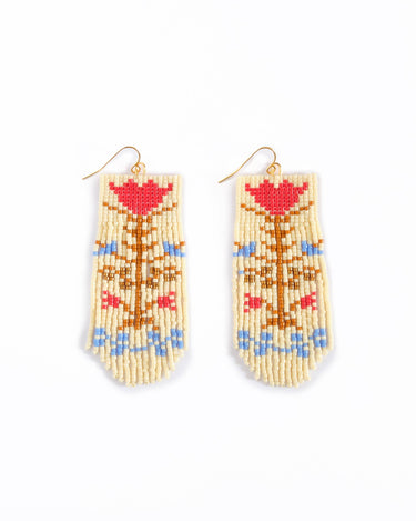 Beaded Handwoven Vintage Flower Fringe Earrings (Cream/Red)