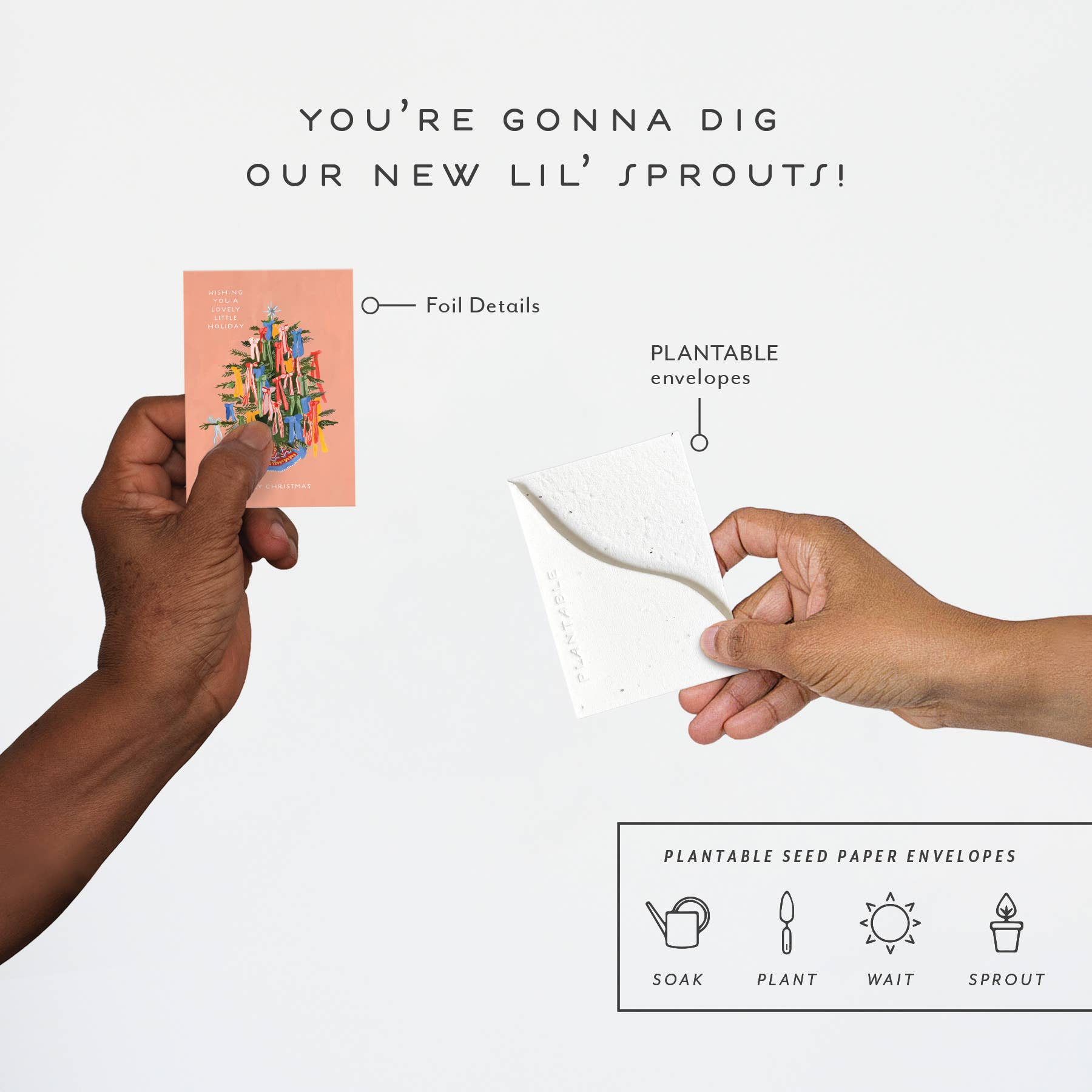 Meet the newest little SPROUT! Think all the goodness of our full size greeting card BUT at a petite "mini me" and super cute enclosure card size. All Seedlings sprouts have foil details and a PLANTABLE seed paper envelope which is embedded with wildflower seeds. This seed paper is made of a biodegradable eco-paper created with post-consumer materials - no trees harmed for this paper! When planted, our envelopes compost away leaving only flowers behind. Blank inside, our mini greeting cards are printed on premium paper and are all accented with foil details. Need a display? Order SPRDIS24 for a 24 pocket tabletop spinner. Card size: 2.5" x 3.5" All Seedlings cards are made in the U.S.A.