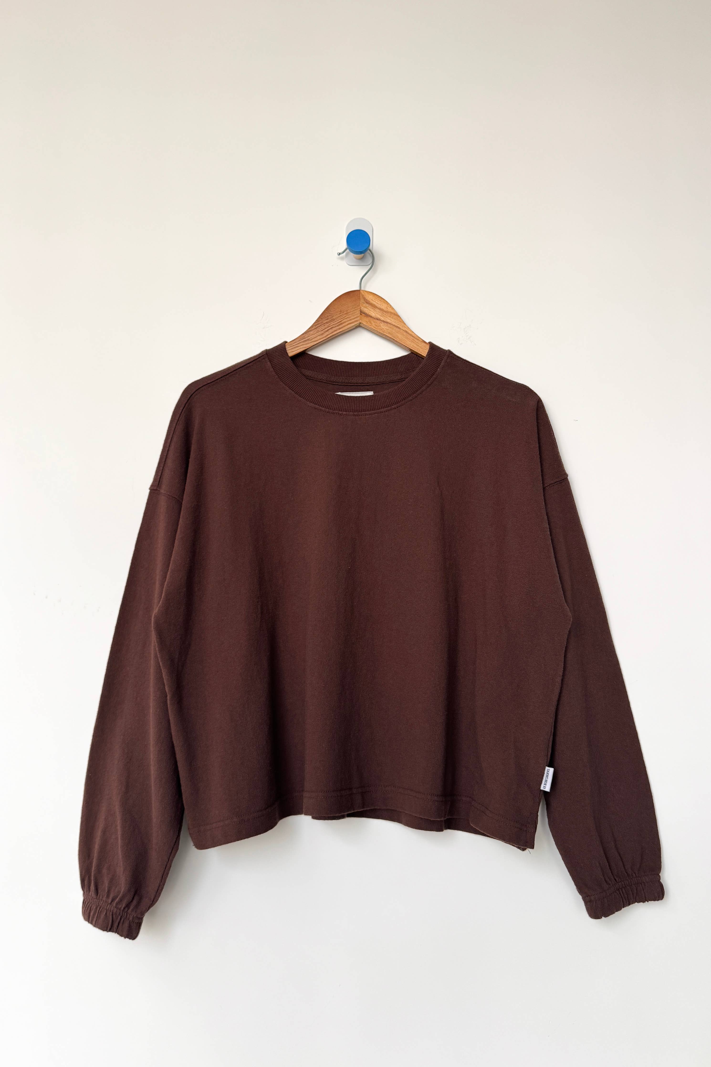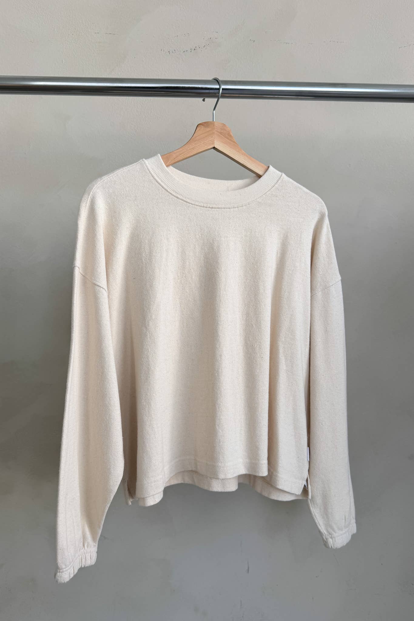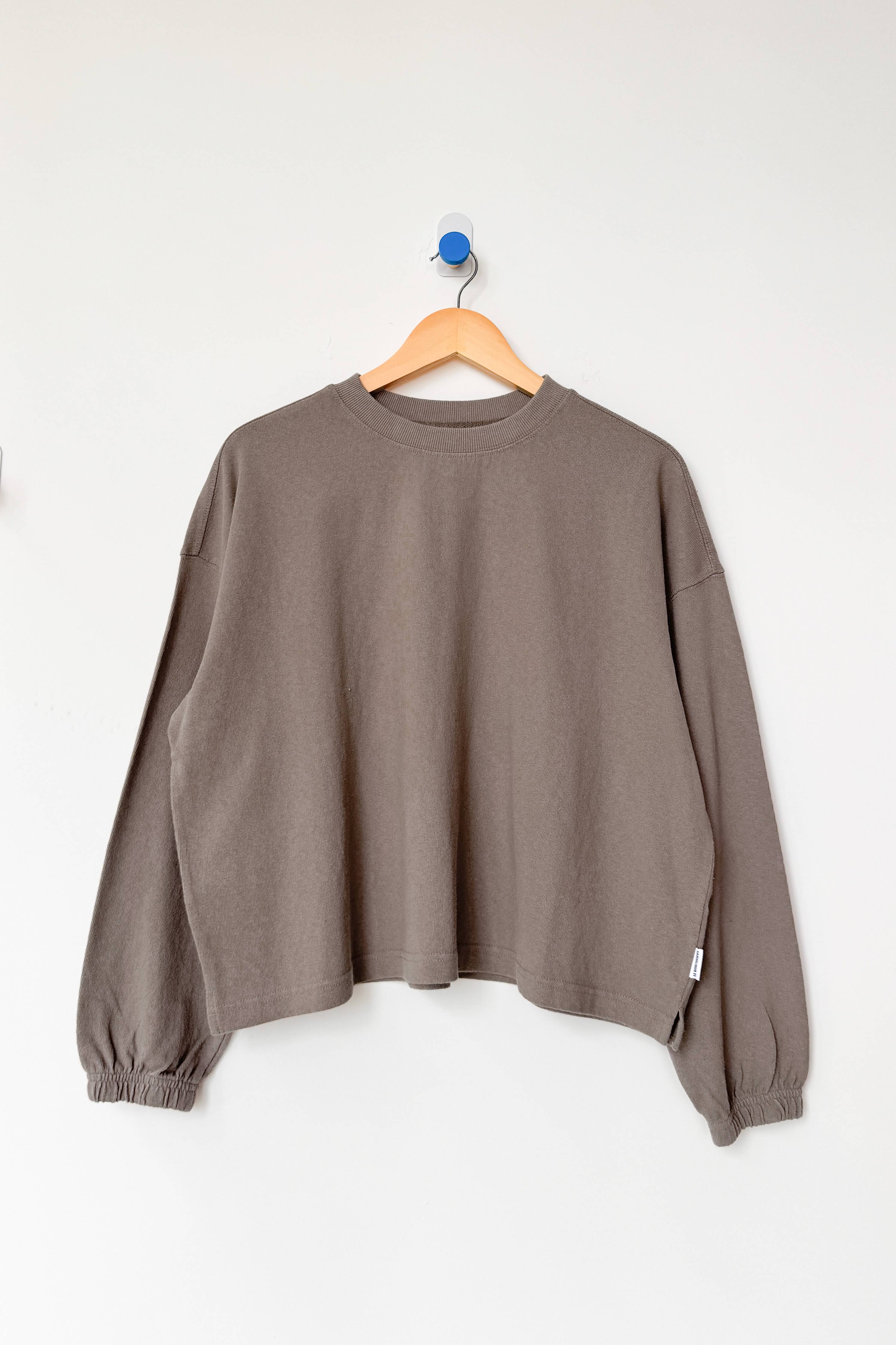We dreamed this beauty up while searching high and low for a simple crew neck long sleeve with a feminine touch that can be a year round closet fave. She has a slightly boxy fit, sits right at the hip and features an elastic ruched sleeve opening that creates a slight balloon sleeve effect worn down and scrunches up beautifully.