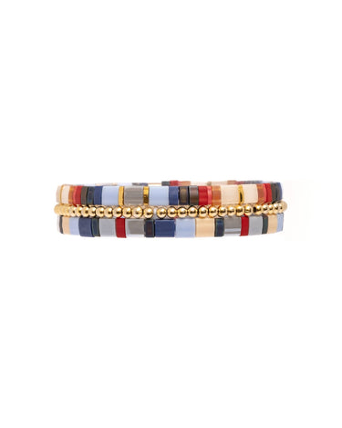 Handwoven with premium Japanese Miyuki glass beads, this stretch bracelet set features 2 distinct but complimentary Tila bracelets and 1 gold-plated ball bracelet for added contrast. Unique color combinations, a sprinkling of 24K gold-plated Tila beads and contrasting matte and shiny beads make this a truly unique bracelet stack. This bracelet set fits a variety of wrist sizes and is perfect on its own or combined with other stacking bracelets. Our jewelry is made in Medellin, Colombia by women artisans from vulnerable populations who receive fair working conditions and compensation for their skills. Materials: Miyuki Glass Tila Beads Gold-Plated Ball Beads Nylon Elastic Cord Size: Circumference 6.8 inches approximately *This bracelet style is available in several color ways. **The last photos are included to show our earring cards and size reference on the model.