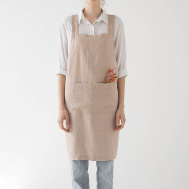 A perfect surprise for anyone that loves cooking or is learning how to cook. The Linen Crossback Apron is comfortable as it has no ties and is easy to put on and off. The humble piece of fabric to bring you joy while cooking. WIDTH: 39" / 100 cm LENGTH: 33" / 83 cm - Two front pockets are perfect for keeping things at hand - 100% linen, 215 g/m2 - Stone washed for extra softness - OEKO-TEX® and EUROPEAN FLAX® certified linen fabric - Custom lengths and widths available upon request EASY CARE: Machine washable (40°C/104°F); tumble dry on low heat; wash separately or with similar colors. Wrinkling is part of linen's charm – the wrinklier the fabric, the purer it is. We do not recommend ironing your linens but if you must, do it on low heat when the garment is still a little damp.