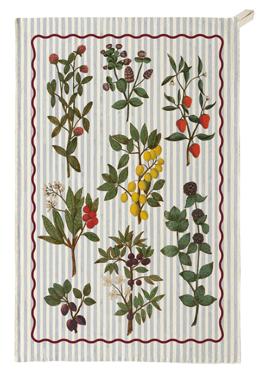 This 100% organic cotton tea towel features remarkable watercolour illustrations of fruits, hand-painted by an unknown artist in the early 1600s, onto the pages of a 1596 book dedicated to the Christening of Lady Elisabeth of Hesse. Roomytown's design team in Bath, UK, have carefully adapted and enhanced the original artwork adding a contemporary striped pattern and applied it to this 100% organic cotton tea towel which comes neatly folded and packaged with a fabric ribbon. Includes hanging loop. Machine washable for everyday use in your kitchen.