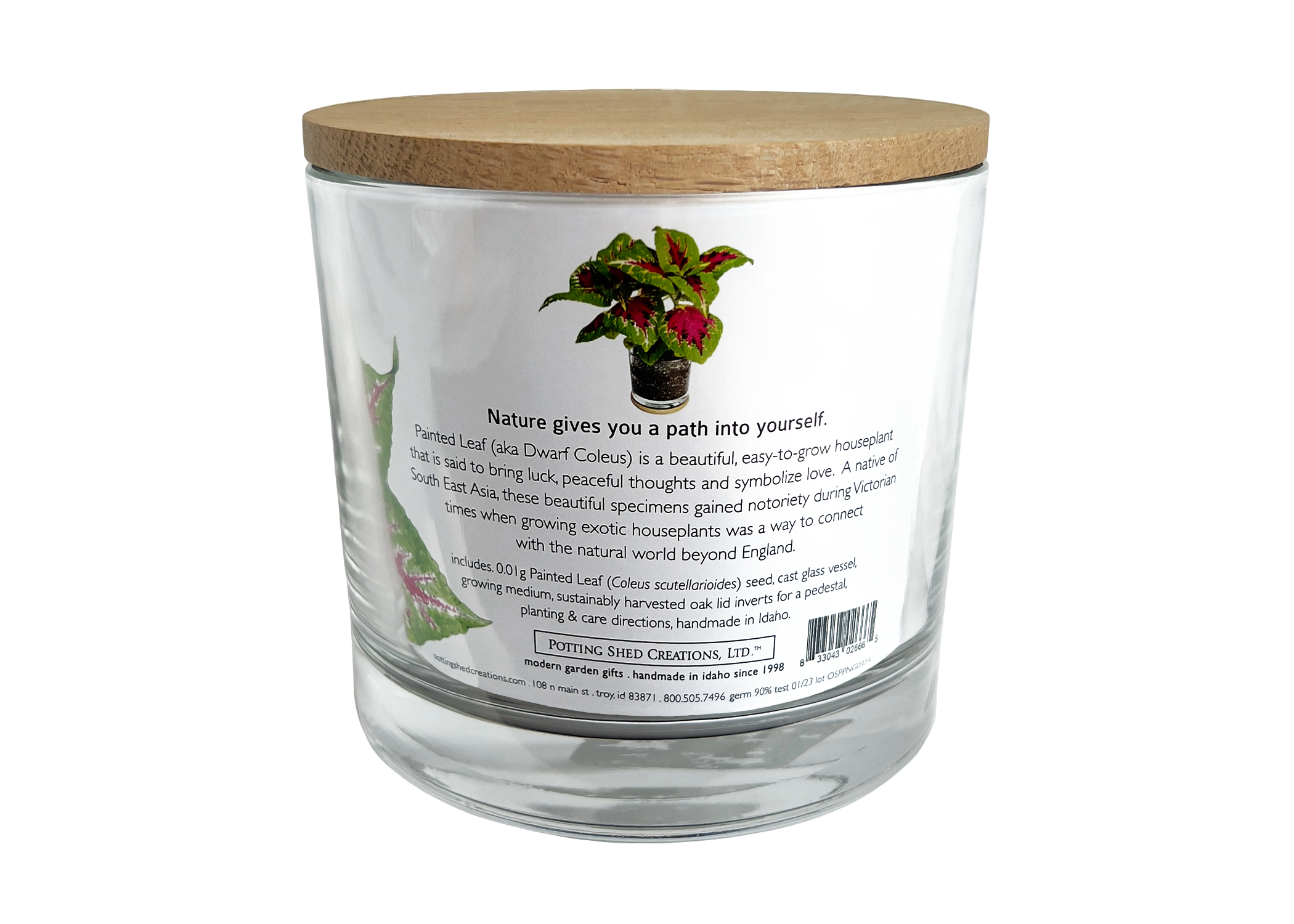 includes. seed, cast glass vessel (5"x5"), growing medium, sustainably harvested oak lid (inverts for a pedestal), planting & care directions, handmade in Idaho.