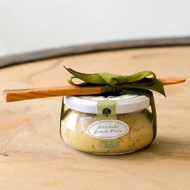 Try our top-selling pesto today! An elegant hostess gift of Artichoke Lemon Pesto dressed with an artisan-made Olivewood knife spreader. Tied with our signature ribbon with a recipe suggestion for Artichoke Dip on the bottom of the jar. Paire with our Bella Dipping Cracker or Pane Rustico flatbread to complete the story.