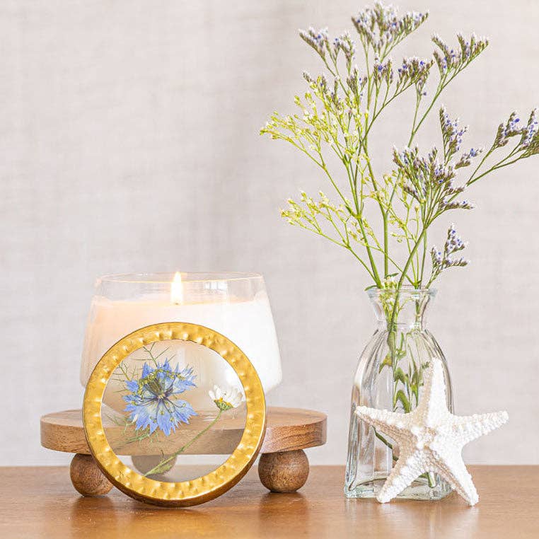 Pressed floral candles feature dreamy floral tableaus displayed between panes of glass. Hand poured with a coconut wax blend. Lovingly handmade in Colorado.