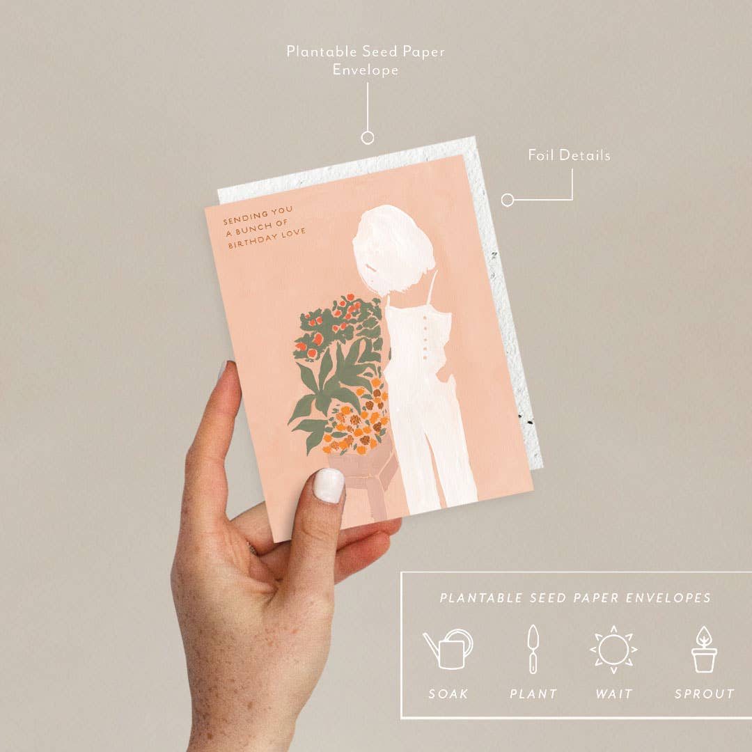 All Seedlings greeting cards have foil details and a PLANTABLE seed paper envelope which is embedded with wildflower seeds. This seed paper is made of a biodegradable eco-paper created with post-consumer materials - no trees harmed for this paper! When planted, our envelopes compost away leaving only flowers behind. Blank inside, our cards are printed on premium paper and are all accented with foil details. All Seedlings cards are made in the U.S.A. Need a display? Order BOUDIS48 for a 48 pocket spinner or BOUDIS24 for our 24 pocket spinner. All of our cards are also available with NO cello. Message us if you want your cards naked! Card size: 4.25" x 5.5" Env: 4.3125" x 5.75" (A2)