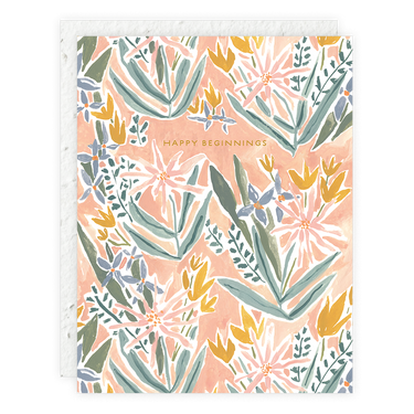 All Seedlings greeting cards have a PLANTABLE seed paper envelope which is embedded with non-invasive wildflower seeds. This seed paper is made of a biodegradable eco-paper created with post-consumer materials - no trees harmed for this paper! When planted, our envelopes compost away leaving only flowers behind. Blank inside, our cards are printed on premium paper and are all accented with foil details. Card size: 4.25" x 5.5" Env: 4.3125" x 5.75" (A2) All Seedlings cards are made in the U.S.A. All of our cards are also available with no celo. Message us if you want your cards naked!