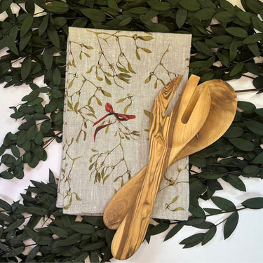 The perfect gift to bring for a dinner party. A gorgeous linen kitchen towel with Olivewood serving utensils