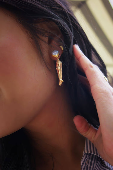 * 24k gold plated over brass * stainless steel post * freshwater pearl * 18k gold plated over stainless steel fish * water resistant * produced in the USA with materials ethically sourced